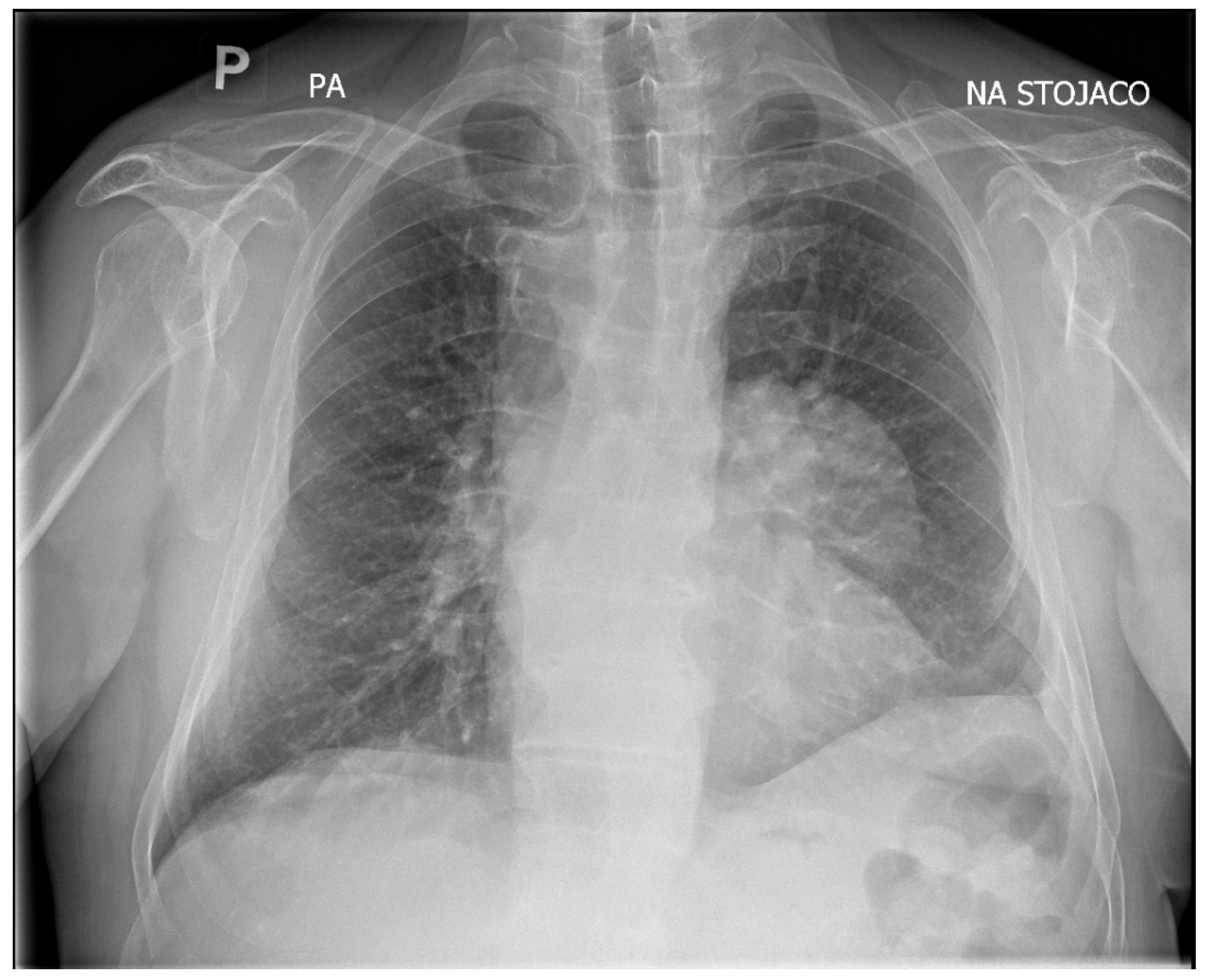 Upon admission, the patient underwent chest X-ray, which demonstrated well-defined consolidation in the left pulmonary hilum (