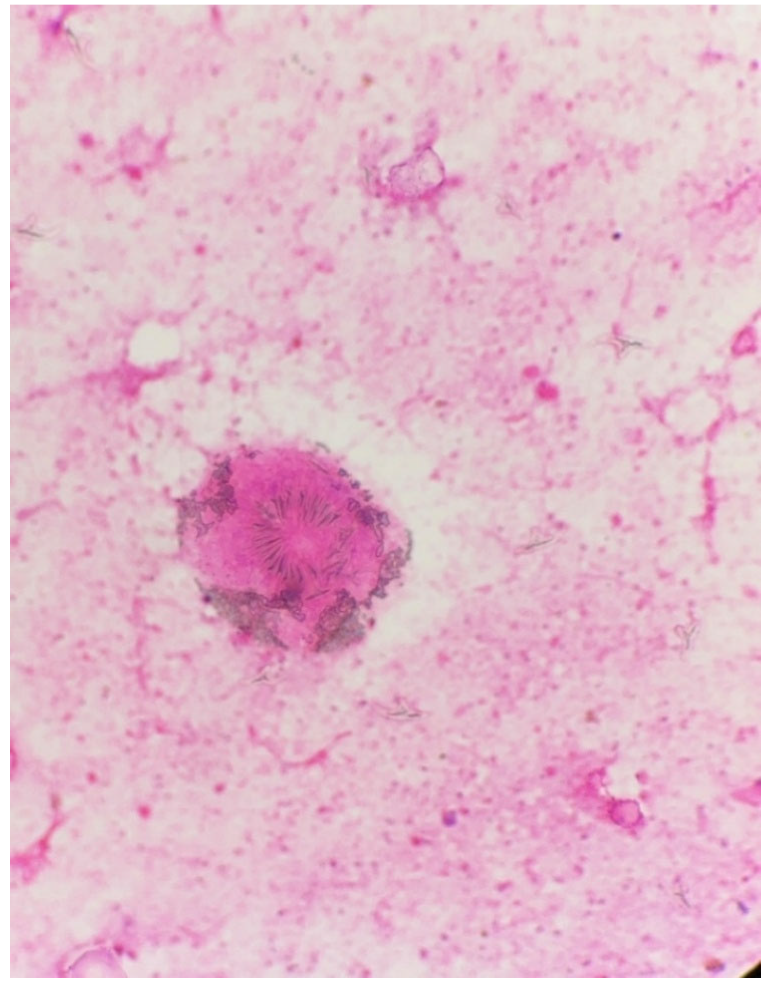 Figure 4). The dimensions of the postoperative specimen are the ex vivo dimensions after removal and dissection of the cyst. The cyst flattened after fluid removal, explaining the difference in dimensions compared to the CT scan, which showed the cyst in situ, filled with fluid. Upon dissection, it had an uneven whitish internal surface with nodular thickening. Biopsies were collected for histological and cytological examination. The cyst fluid had not previously been aspirated for independent analysis. Cytological examination involved making a smear from the inner surface of the cyst wall, but only biopsies from the cyst wall, not from the nodular portion, were collected for histological examination. The cyst wall showed signs of necrosis and the presence of histiocytes and lymphoid cells. Cytological examination revealed structures consistent with protoscolex (