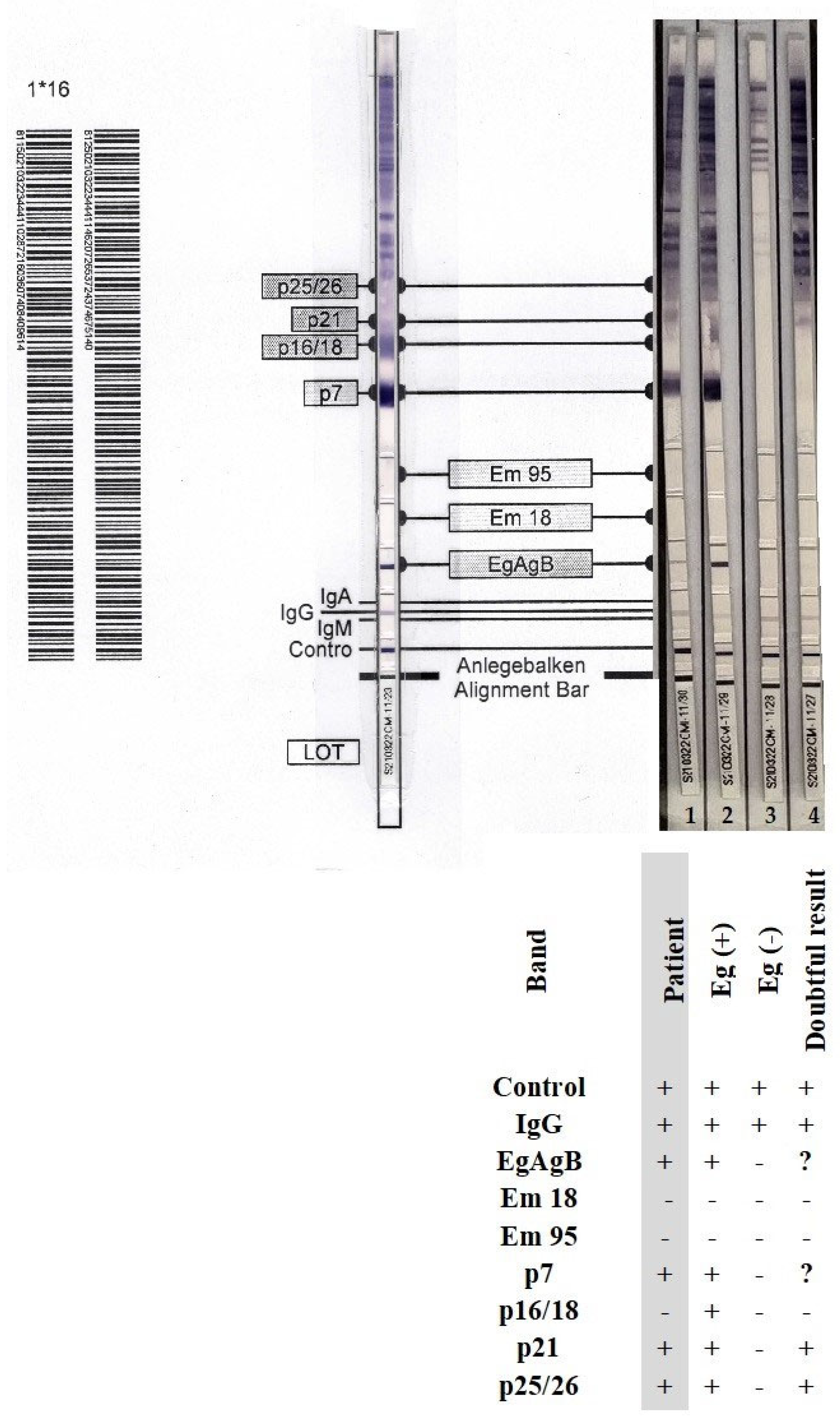 E. multilocularis based on the presence of the following immunoreactive bands: EgAgB, p7 (7 kDa), p21 (21 kDa), and p25/26 (24–26 kDa). The patient’s serological result was indicative of