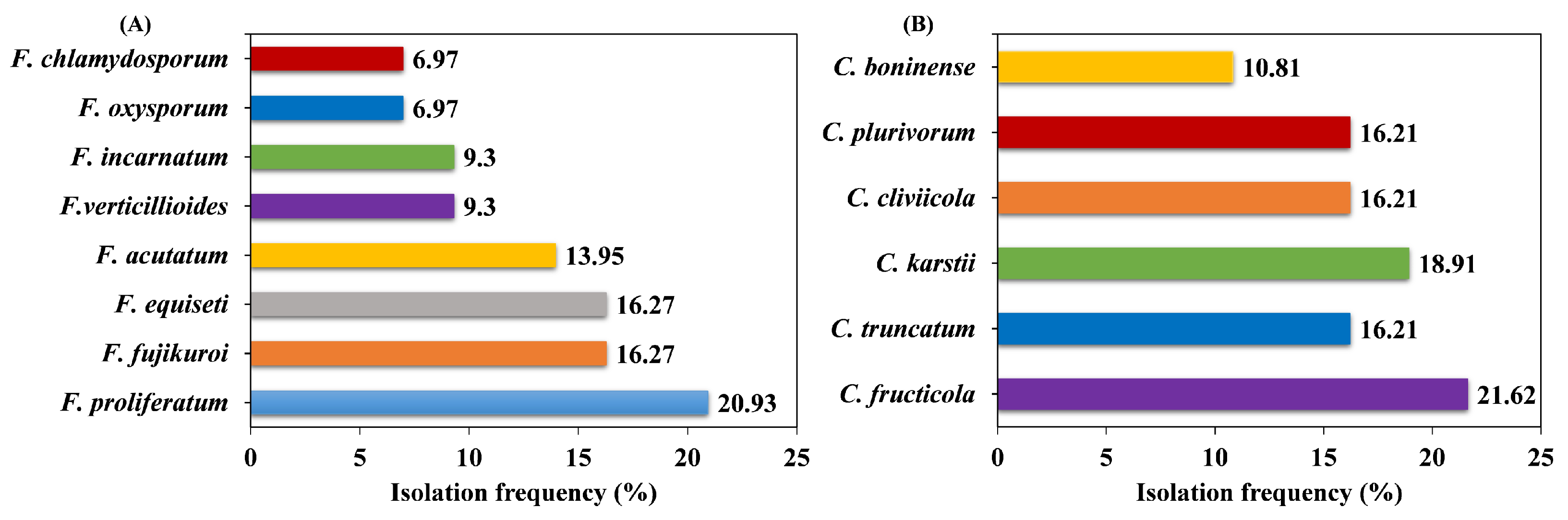 3.4. Isolation Frequency of Fusarium and Colletotrichum Species