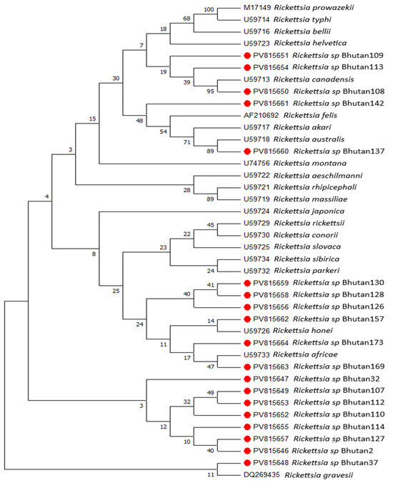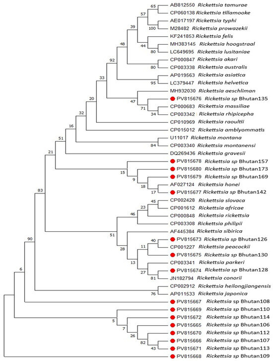 Phylogenetic tree of the rickettsial DNA sequences based on the citrate synthase (gltA) gene. The evolutionary history of the Rickettsia. Citrate synthase gene (gltA) identified in Bhutan was inferred using the Neighbour-Joining method [22]. The bootstrap consensus tree inferred from 1000 replicates is taken to represent the evolutionary history of the analyzed taxa [26]. Branches corresponding to partitions reproduced in less than 50% bootstrap replicates are collapsed. The percentage of replicate trees in which the associated taxa clustered together in the bootstrap test (1000 replicates) is shown next to the branches [26]. The evolutionary distances were computed using the Kimura 2-parameter method [25] and are in the units of the number of base substitutions per site. The analysis involved 48 nucleotide sequences. Codon positions included were 1st + 2nd + 3rd + Noncoding. All ambiguous positions were removed for each sequence pair. There was a total of 494 positions in the final dataset. Evolutionary analyses were conducted in MEGA7 [23]. Red dots in the tree indicate the five sequences characterized in this study.