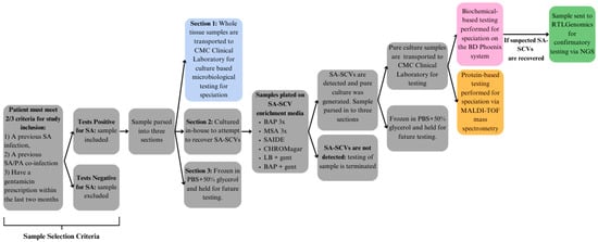 Figure 2. Workflow for SA-SCV identification. Workflow of process to select, enrich, and screen specimens for SA-SCVs through a variety of procedures and tests. Samples were selected based on sample selection criteria and proceeded to move through workflow as specimens continued to meet suspected SA-SCV requirements.