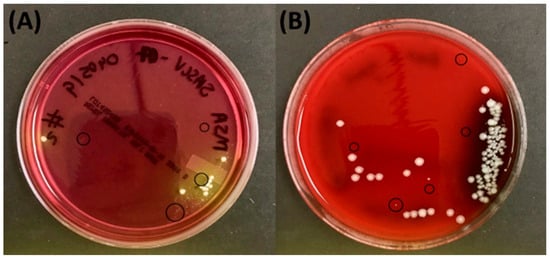 Figure 3. Suspected SA-SCVs from clinical chronic wound specimens on (A) MSA and (B) BAP+ gentamicin. Images of suspected SA-SCV colonies on agars that select for (A) Staphylococci (MSA plate) or (B) gentamicin-resistant organisms (BAP+ gentamicin), incubated at 37 °C for 48 h. Suspected SA-SCVs are circled. Example of how suspected SA-SCVs were grown direct from sample alongside colonies that are not of interest in this study, then subsequently isolated for pure culture, and included in downstream analysis.