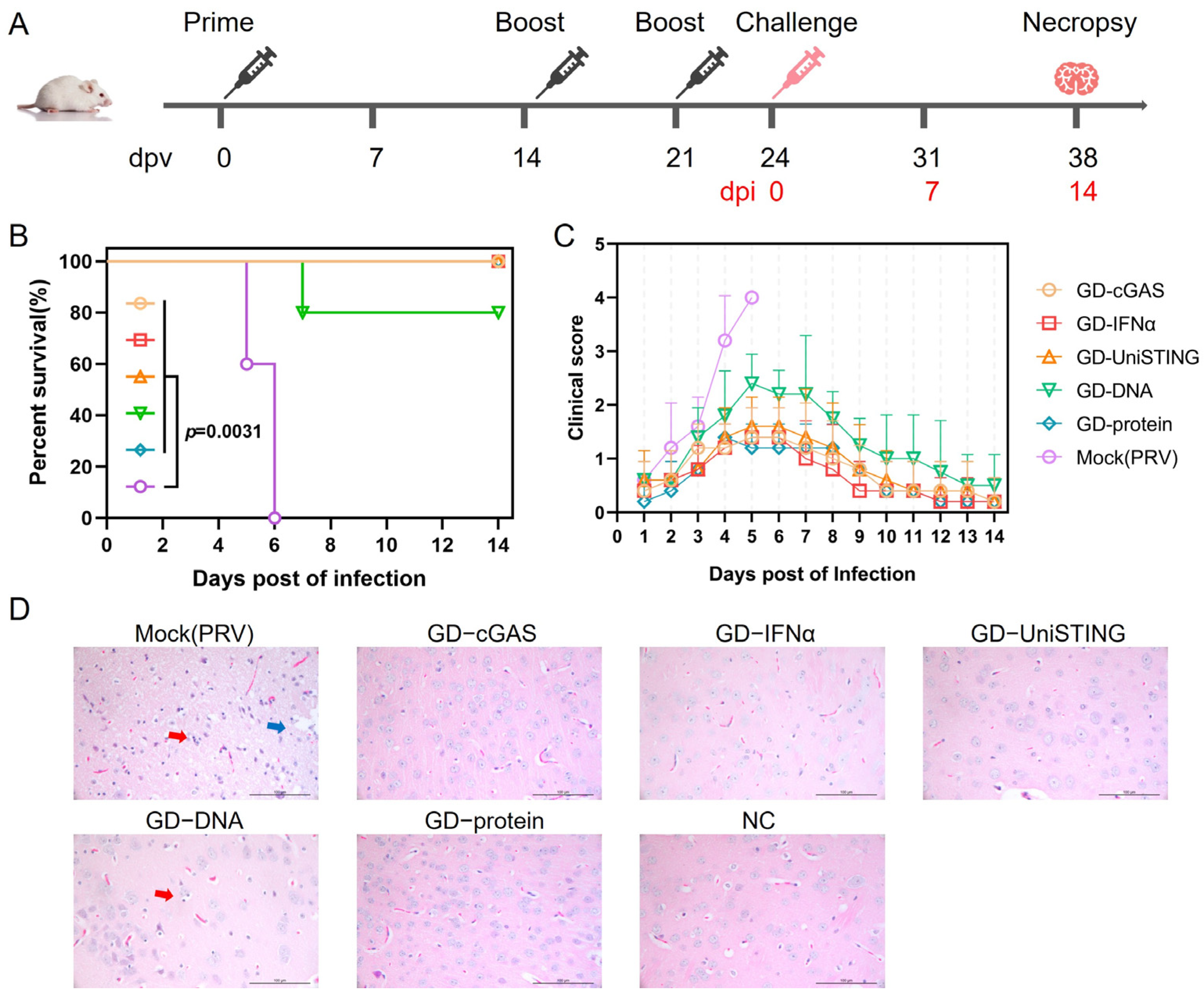 5]. In contrast, our study demonstrated that the present formulation enabled 100% survival in mice challenged with lethal PRV as early as 3 days after completion of the immunization protocol. These findings demonstrate that the use of cGAS, UniSTING, and IFN-α as immune-stimulating adjuvants can significantly increase early immune activation, thereby rapidly inducing an immune response and substantially advancing the onset of vaccine-mediated protection. This approach may effectively narrow the immunological gap in practical applications. Furthermore, prior studies have investigated the protective efficacy of both an mRNA vaccine encoding the PRV gD gene and a DNA vaccine expressing the PRV gD protein via the recombinant plasmid pVAX-gD. Both the mRNA and pVAX-gD plasmids induced high levels of neutralizing antibodies and antigen-specific B and T cell responses in mice. When challenged with the PRV-XJ strain at 8 weeks after primary immunization, 90% of mRNA-vaccinated mice survived, whereas 100% of DNA-vaccinated mice survived [