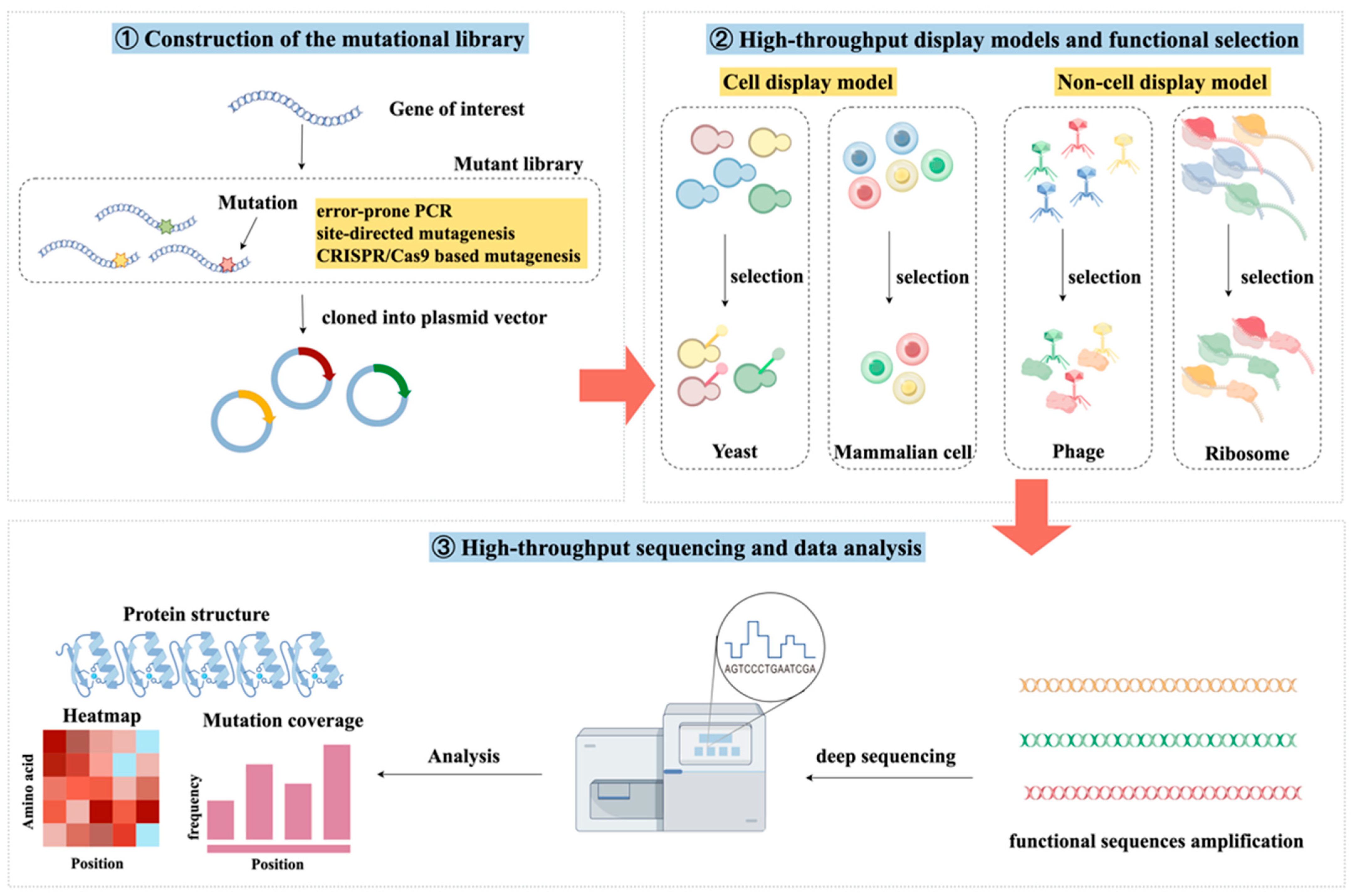 Mammalian display | Rely on viral or plasmid vectors to introduce mutants into cells one by one, and display them inside cells or on the surface through transmembrane anchoring or secretion capture. |