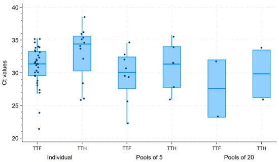 Box plot of Ct values of tongue tip fluids (TTF) and tongue tip homogenate (TTH), according to their pooling strategy.