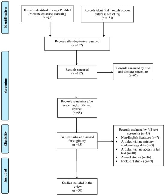 The database search yielded 237 records from PubMed/Medline and Scopus. After removing duplicates, screening titles and abstracts, and applying citation chasing, 50 studies met the inclusion criteria and were included for full review, representing 55 individual cases [3,5,6,7,8,9,10,11,12,13,14,15,16,17,18,19,20,21,22,23,24,25,26,27,28,29,30,31,32,33,34,35,36,37,38,39,40,41,42,43,44,45,46,47,48,49,50,51,52,53]. The selection process is illustrated in Figure 1.
