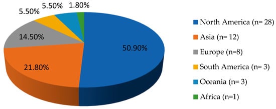 Geographical distribution of Nocardia spp. osteomyelitis cases worldwide (n = 55).