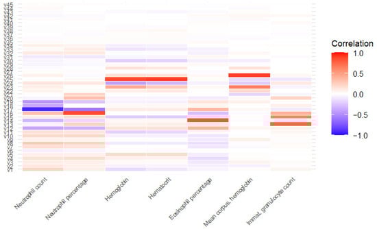 A correlation analysis (Figure 1) identified seven variables (neutrophil count, neutrophil percentage, hemoglobin, hematocrit, eosinophil percentage, mean corpuscular hemoglobin and immature granulocyte count) that were highly correlated with others (significant correlation >0.7) and were excluded from subsequent analyses. After applying the variable importance algorithm using “ref”with Random Forest, all variables were selected as important, indicating that none were discarded due to lack of relevance in the model.