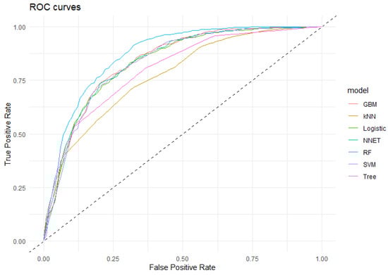 The seven selected machine learning algorithms were trained on the training set with the following parameters: k = 9 in kNN, mtry = 2 in RF, sigma = 0.01530869 and C = 0.5 in SVM, n.trees = 150, interaction.depth = 3, shrinkage = 0.1 and n.minobsinnode = 10 in GBM. The percentage of minority group values was almost 39%, therefore it was not considered an unbalanced study. After applying them to the test set for validation, the Random Forest and Gradient Boosting Machine algorithms demonstrated the best performance, with accuracies of 82.2% and 78.2%, respectively. Meanwhile, the Support Vector Machine algorithm, neural network and logistic regression yielded more modest results, with accuracies around 77%. The decision tree models and kNN also performed well overall, although their accuracy was slightly lower (Table 3).