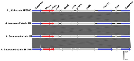 - Hamidian, M.; Hancock, D.P.; Hall, R.M. Horizontal transfer of an ISAba125-activated ampC gene between Acinetobacter baumannii strains leading to cephalosporin resistance. J. Antimicrob. Chemother. 2013, 68, 244–245. [Google Scholar] [CrossRef]