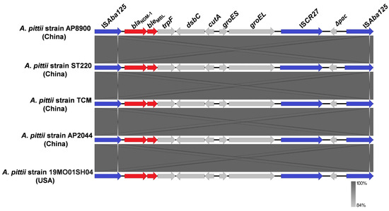 In this study, the blaNDM-1 of strain AP8900 was found to locate on the composite transposon Tn125, which is bracketed by two ISAba125s in the same orientation, forming the structure “ISAba125-blaNDM-1-bleMBL-trpF-dsbC-cutA-groES-groEL-ISCR27-ISAba125.” Notably, only five strains of A. pittii with complete genomes harboring chromosome-borne blaNDM (all blaNDM-1) were found, all carrying the nearly identical Tn125 carried by AP8900, which was highly similar to the initially identified Tn125 [22]. The 1087 bp insertion sequence ISAba125 carried by Tn125 belongs to a member of the IS30 family of insertion elements [22,43]. It has been suggested that the blaNDM gene has been acquired into Acinetobacter spp. from the environment and then has spread to the Enterobacteriaceae with the help of the ISAba125 [44]. Notably, for the Tn125, the ISAba125 upstream of the blaNDM has been reported to provide the -35 region of a promoter necessary for the expression of blaNDM-1 [45]. In addition to blaNDM-1, the ISAba125 was also reported to activate the horizontal transfer of ampC gene among A. baumannii strains leading to cephalosporin resistance [46]. The groES-groEL-ISCR27 section (adjacent to the other copy of ISAba125) may originate from Xanthomonas sp. [47]. It is hypothesized that ISCR27, employing a rolling-circle transposition mechanism [48], initially mediated the ancestral mobilization of blaNDM in Xanthomonas sp. and precisely positioned it downstream of ISAba125 [22,47]. Moreover, the consistent presence of ISAba125 in all blaNDM-positive strains so far, along with early observations in A. baumannii, proposed that Tn125 was the ancestral transposon facilitating the mobilization of blaNDM, and A. baumannii was its ancestral host [47,49].