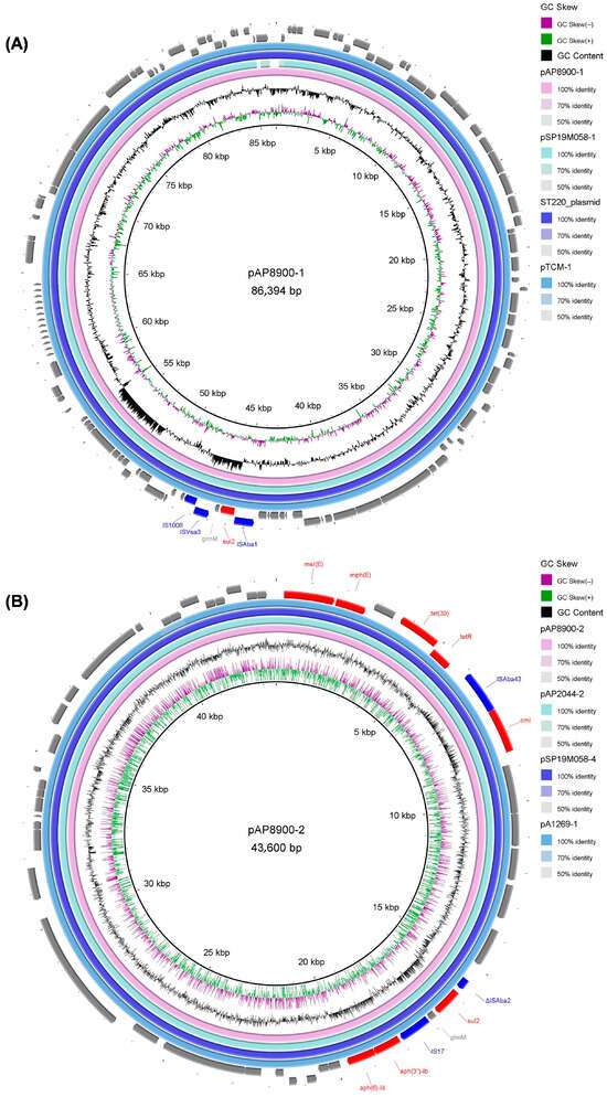Based on the results of the BLAST search against the GenBank nr database, the 86.39-kb plasmid pAP8900-1 had high similarity with the plasmid pSP19M058-1 in A. pittii strain 19MO01SH04 (99.00% coverage and 99.99% identity), the plasmid in A. pittii strain ST220 (100.00% coverage and 99.82% identity), and the plasmid pTCM-1 in A. pittii strain TCM (100.00% coverage and 99.93% identity) (Figure 4A). In addition, BLAST search against the GenBank nr database also showed that the 43.60-kb plasmid pAP8900-2 was highly similar to the plasmid pAP2044-2 in A. pittii strain AP2044 (100.00% coverage and 99.92% identity), the plasmid pSP19M058-4 in A. pittii strain 19MO01SH04 (100.00% coverage and 99.99% identity), and the plasmid pA1269-1 in A. pittii strain A1269 (100.00% coverage and 100.00% identity) (Figure 4B).