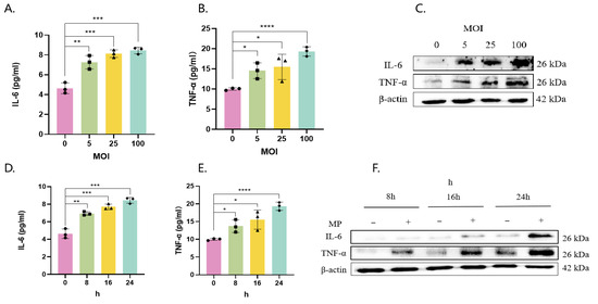 The levels of IL-6 and TNF-α in the supernatant (Figure 2A,B) and those of cellular proteins (Figure 2C,F) in Beas-2b cells infected with MP increased in a manner dependent on both the multiplicity of infection (MOI) (Figure 2A–C) and time (Figure 2D–F).