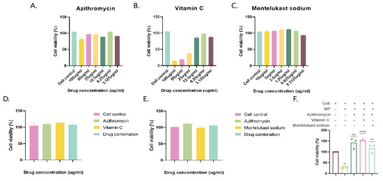 Determination of optimal drug concentrations and MP infection and drug therapy. Azithromycin, vitamin C, and montelukast sodium were added to cells after gradient dilution to determine cell viability (A–C), and then azithromycin and vitamin C were added to cells in combination, and azithromycin and montelukast sodium were added to cells to determine cell viability (D,E). Cell viability after treatment with MP bacteria and drugs (+, with drug; −, without drug). (F) The results of 3 independent experiments were expressed and analyzed statistically by t-test.