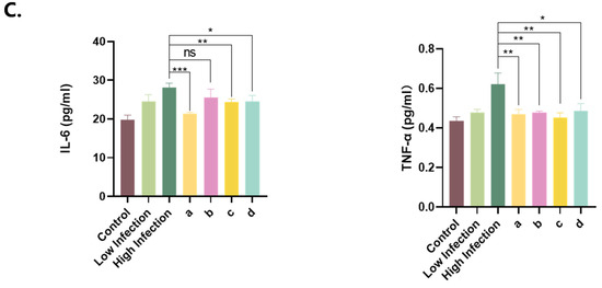 The results showed that the polyclonal antibody had a significant effect in terms of reducing IL-6 and TNF-α secretion (Figure 4A,B) and expression (Figure 4C).