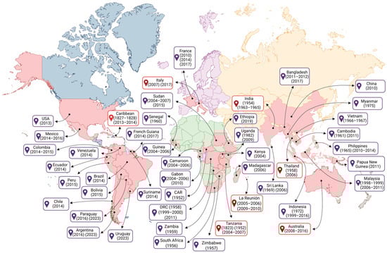 Global epidemiology of the Chikungunya virus over time. Initially reported on the African continent, CHIKV, driven by trade and the traffic of travelers between different regions of the world, has spread to every continent except Antarctica. That figure presents a chronological sequence of CHIKV amplification around the world over the years, considering the year in which it was first reported or in which new outbreaks or epidemics occurred. The red text boxes highlight the countries where the first reported cases of the disease occurred on the continent. Each continent is represented by a color: blue (Americas), green (Africa), purple (Europe), orange (Asia), and brown (Oceania). Countries where CHIKV presence has been reported are shown in red. Please note that not all affected countries are shown. Created in BioRender. Oliveira, F. (2025) https://BioRender.com/15wrcvb (accessed on 12 October 2025).