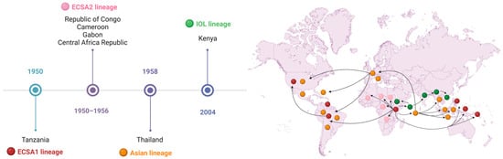 The chronology of the emergence of the different Alphavirus chikungunya’s strains over time, following their geographical origin and subsequent spread. CHIKV has four main genotypes, resulting from adaptive mutations that have occurred over time. Chronologically, the first genotype described refers to the East South Central African lineage (ECSA1) (in red), followed by the West African lineage (ECSA2) (in pink), the Asian lineage (in yellow), and the Indian Ocean lineage (IOL) (in green), which spread to various countries around the world. Created in BioRender. Oliveira, F. (2025) https://BioRender.com/15wrcvb (accessed on 28 February 2025).