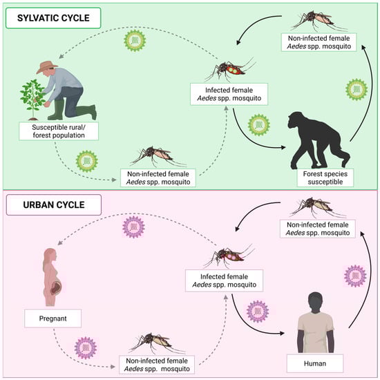 CHIKV is transmitted by a sylvatic cycle (also known as enzootic) and an urban cycle (Figure 3). Transmission occurs mainly through the mosquito vectors Ae. albopictus and Ae. aegypti. However, CHIKV has also been detected in other species of the Ae. genus, such as Ae. fucifer, Ae. taylori, Ae. luteocephalus, Ae. africanus, Ae. neoafricanus and Ae. cordellieri []. The sylvatic cycle was demonstrated in the 1960s, in a study that isolated CHIKV from a pool of the forest mosquito Ae. africanus collected in the forest canopies of Uganda []. In this study, after infection of mice and rhesus monkeys with the virus, both species developed the disease, demonstrating that they are viable hosts for viral replication and propagation. Subsequently, another study using experimentally infected vervet monkeys (Chlorocebus pygerythrus) demonstrated that the animals produced CHIKV antibodies after infection, suggesting once again the involvement of non-human primates (NHP) in a sylvatic transmission cycle []. Thus, this cycle involves the transmission of the virus by forest-dwelling mosquito vectors to NHP (e.g., monkeys, baboons, and squirrels) []. Occasionally, humans may be accidentally infected when they move around or live near forests. In the urban cycle, the virus is transmitted by mosquito vectors to humans. CHIKV transmission depends on environmental factors, such as rainfall and altitude, ecological factors, including competent mosquito vectors, and social factors, including human mobility, socioeconomic status, and lifestyle [,,,].