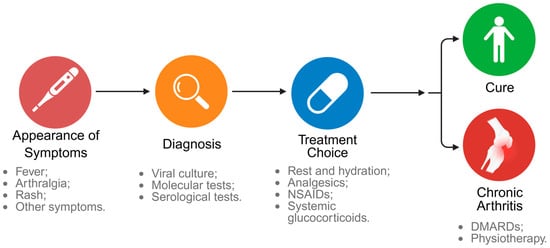 The diagnosis of CHIKV infection is based on a combination of clinical, epidemiological, and laboratory data, and is essential to guide the initiation of treatment, which is currently limited to symptomatic relief and supportive therapies. Figure 5 summarizes the main diagnostic methods and treatments indicated for CHIKV.