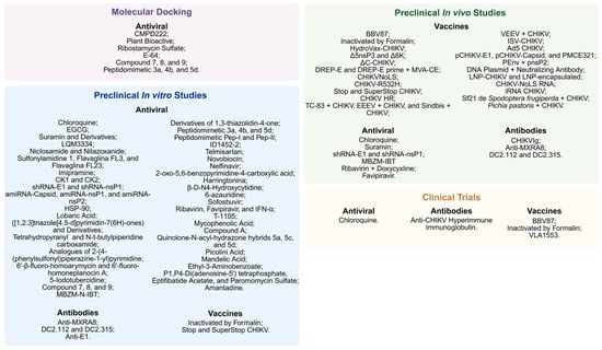 - Hucke, F.I.L.; Bugert, J.J. Current and Promising Antivirals Against Chikungunya Virus. Front. Public Health 2020, 8, 618624. [Google Scholar] [CrossRef]