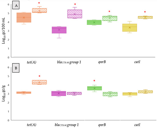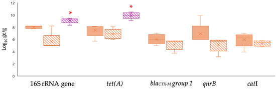 - Cavé, L.; Brothier, E.; Abrouk, D.; Bouda, P.S.; Hien, E.; Nazaret, S. Efficiency and sensitivity of the digital droplet PCR for the quantification of antibiotic resistance genes in soils and organic residues. Appl. Microbiol. Biotechnol. 2016, 100, 10597–10608. [Google Scholar] [CrossRef]