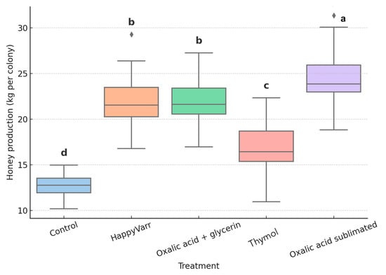 Honey yield (kg per colony) in Apis mellifera colonies treated with different organic acaricides. Different letters above the bars indicate statistically significant differences among treatments according to the Steel–Dwass multiple comparison test (p < 0.05). Treatments sharing the same letter do not differ significantly.