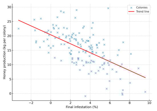 Spearman’s rank correlation between final Varroa destructor infestation and honey yield per colony.