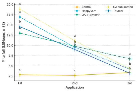 Interaction between acaricide treatment and application number on Varroa destructor mite fall (LSMeans ± SE). Different letters above the points indicate statistically significant differences among treatments within each application, according to the Tukey–Kramer multiple comparison test (p < 0.05). Treatments sharing the same letter do not differ significantly.