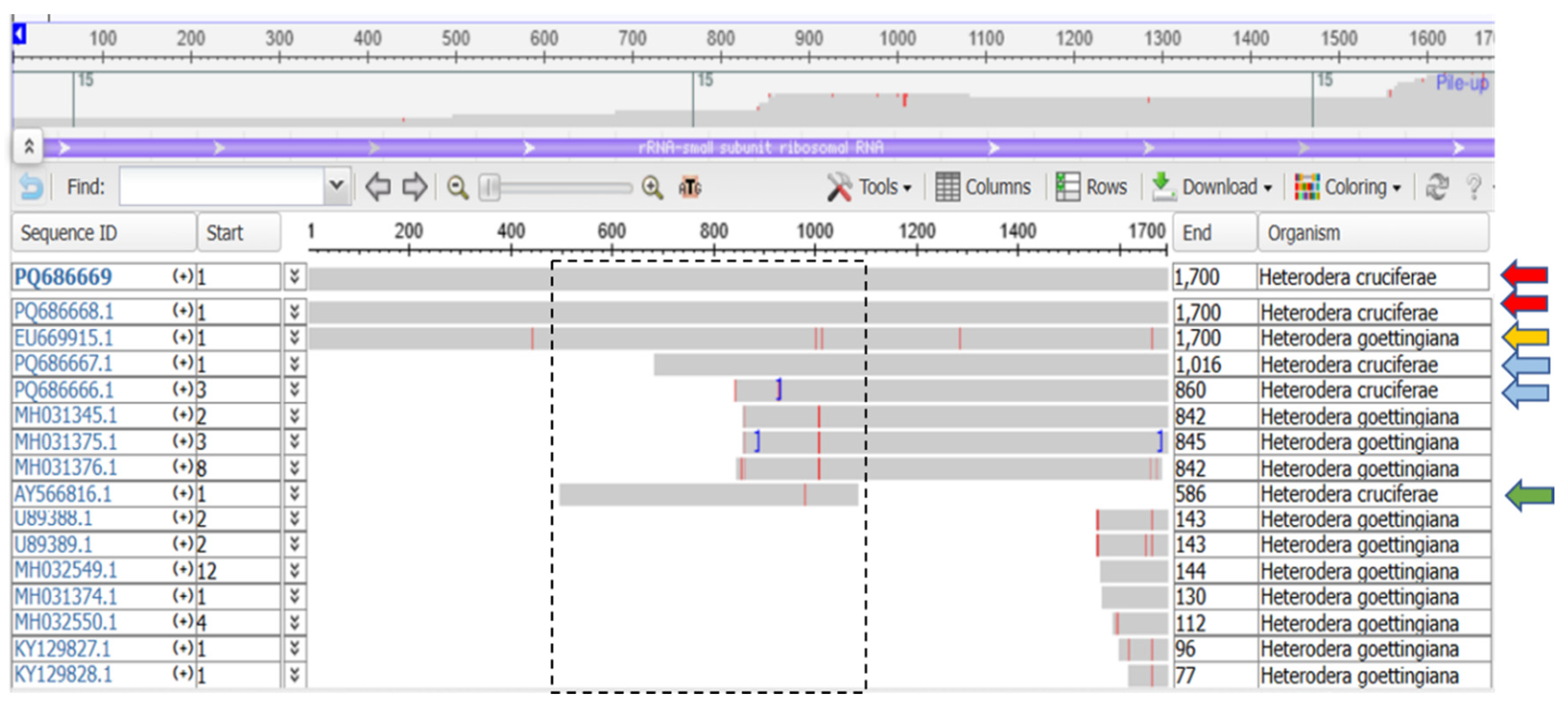 18S rDNA | PQ686668 | H. cruciferae (AY566816) H. goettingiana (EU669915) H. carotae H. carotae | 34% 100% No data No data | 99.83% 99.71% No data No data | Partial 18S rDNA similarity; only one H. cruciferae sequence available (586/1700 bp), while H. goettingiana sequence is complete, increasing misidentification risk. Identification confirmed by mtCOI and ITS-rDNA (18L/ITS4mod). This isolate adds a new database contribution. | |