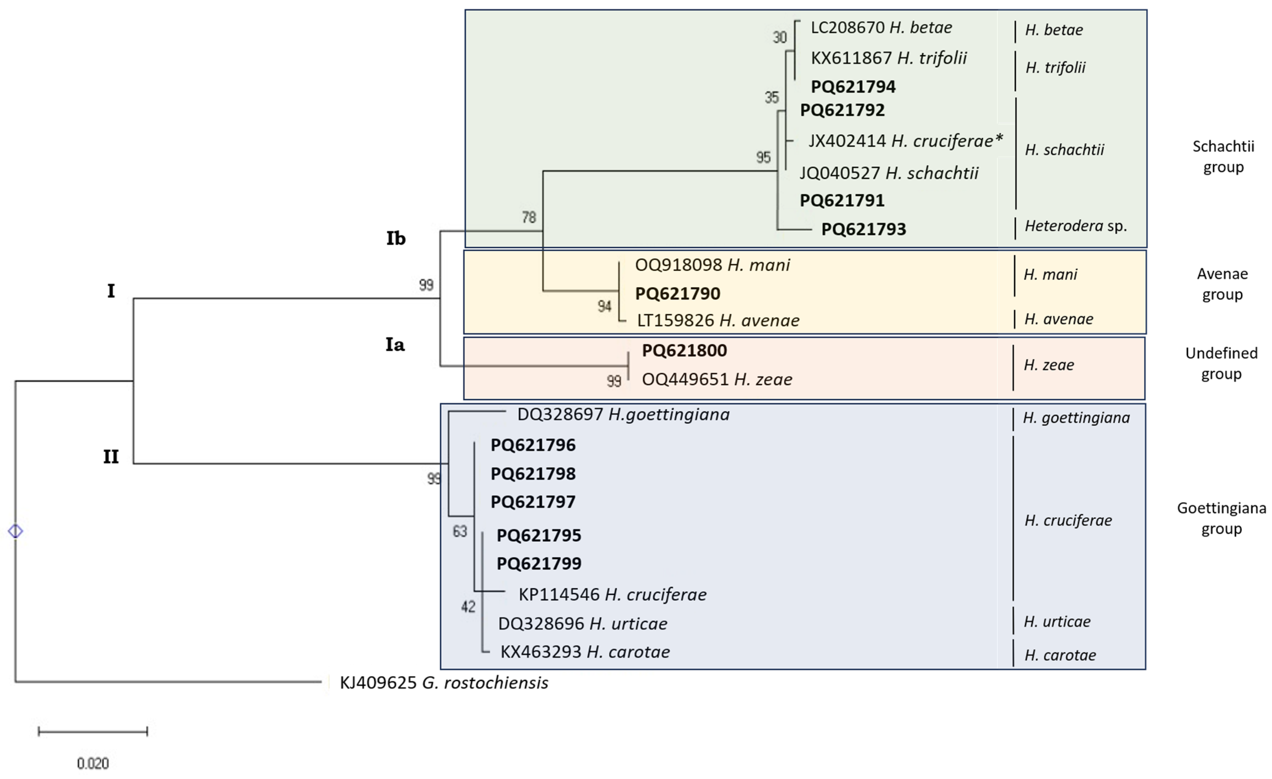 ITS | PQ686672 | H. schachtii (LC208693) H. trifolii (AY590283) H. betae (EF611122) | 100% 100% 100% | 99.9% 98.96% 98.45% | Confirmed as H. schachtii; ITS-rDNA is highly variable, enabling species-level identification with strong support (99% bootstrap). | |