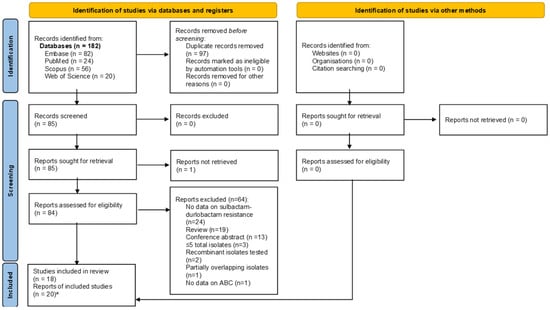 The detailed search strategy is presented in Supplementary File S1. Terms such as “sulbactam–durlobactam”, “resistance”, “non-susceptibility”, “MIC”, and “disk diffusion” were used. Additional articles were identified through manual screening of reference lists. Duplicate articles were removed using the Rayyan tool’s automatic DOI-based deduplication. We screened all retrieved studies in full text.