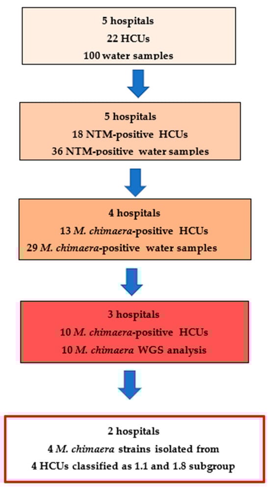30. Cannas, A.; Campanale, A.; Minella, D.; Messina, F.; Butera, O.; Nisii, C.; Mazzarelli, A.; Fontana, C.; Lispi, L.; Maraglino, F.; et al. Epidemiological and Molecular Investigation of the Heater–Cooler Unit (HCU)-Related Outbreak of Invasive Mycobacterium chimaera Infection Occurred in Italy. Microorganisms 2023, 11, 2251. [Google Scholar] [CrossRef]