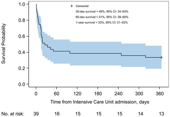 Twenty-one PLWH (53.9%) died during the ICU stay. The 30-day and 1-year mortality rates were 51.3% (n = 20) and 66.7% (n = 26), respectively. Most deaths occurred within the first 60 days of follow-up; the estimated probability of survival at day 60 was 0.41 (95% confidence interval [CI]: 0.28 to 0.60) (Figure 1). The median time to death was 26 days, and the estimated probability of survival at 1 year was 0.33 (95% CI: 0.21 to 0.52).