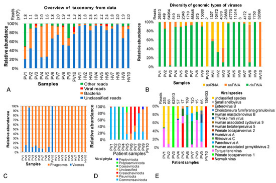 Overview picture of taxonomic annotation and viral composition in metagenomic datasets from gut phageome of heathy children and children with persistent diarrhea of unknown cause. (A) Taxonomic annotation at kingdom level. (B) Vial genomic types identified in the metagenomic data. (C) Relative abundances of phage and viral communities of in the samples. (D,E) Taxonomic classification and relative abundances of viruses at phylum and species levels, respectively, in samples PV1–PV10 (persistent diarrhea group) and HV1-HV10 (healthy group).