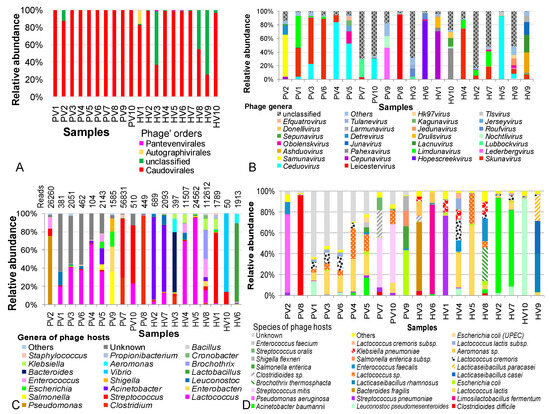 A total number of 22 classified phages in PV and 21 phages in HV samples, together with their bacterial preys, were enumerated and compared across samples. In addition to highly abundant phages, some low-abundance phages were grouped as “others”, accounting for 0.4–11.3% and 1.6–10.6% of the PV and HV datasets, respectively (Figure 5).