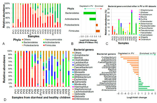 Analysis of diversity and contribution of intestinal bacteria carrying genes integrated into phageomes in children with not-yet-identified pathogenic diarrhea and healthy controls across different taxonomic levels. (A) Diversity and relative abundance of bacteria at phylum level. (B) Log2-fold changes in mean relative abundances of representative bacterial phyla. (C) Bacterial genera enriched in either PV or HV samples. (D) Distribution of bacterial genera present in both PV and HV samples. (E) Differentiation of bacteria at genus level expressed by log2-fold changes. PV: NIPD sample; HV: healthy sample.