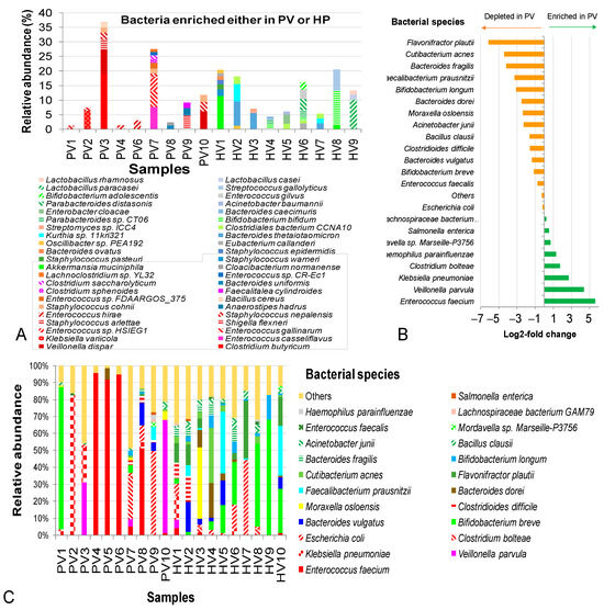 Intestinal bacteria carrying genes integrated in phageomes from children with not-yet-identified pathogenic diarrhea (NIPD) and healthy children at species level. (A) Bacterial species enriched in either PV samples or HV samples. (B) Log2-fold changes in mean bacterial abundances between PV and HV groups. (C) Bacterial contribution in PVs and HVs datasets. The framed species were observed only in the healthy group. PV: NIPD sample; HV: healthy sample.