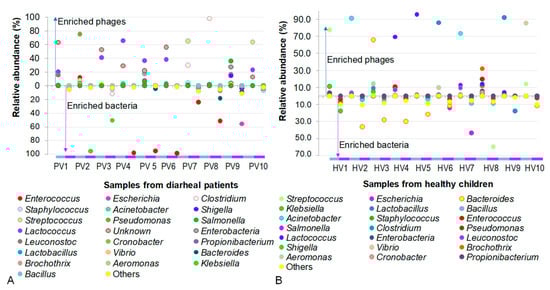 Previous studies have shown that the gut microbiota of children under 2 years old is dominated by Bifidobacterium before weaning, followed by Bacteroides, Streptococcus and also Enterobacteriaceae as they grow older [50]. In our study, Bifidobacterium was not detected in 6 diarrhea and 2 healthy samples, which may be related to (1) poor utilization of human milk oligosaccharides in diarrheal children, as described in a previous study [51]. In children fed with their mother’s breastmilk, Bifidobacterium can accumulate up to 80% bacterial community [51], while in healthy children fed by formular milk, the relative abundance of Bifidobacterium was found to be about 20% bacterial community [51], similar to the abundance of this genus in our study (19.5%); (2) disruption of bacterial dynamics caused by diarrhea. Together, these results suggest that the bacterial fraction in the metagenomic data of phageomes reflected a clear tendency of bacterial dynamics as findings from whole metagenomic DNA [51] and 16S rRNA V3-V4 amplicon analysis [47,48,49].