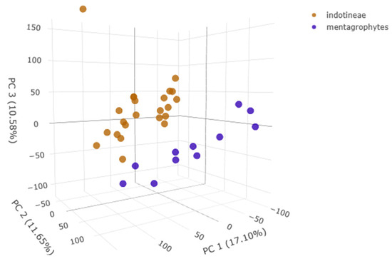 The integration of MALDI-TOF mass profiles and machine learning analysis allows for improving species discrimination. In particular, the PLS-DA plot (Figure 1) created on the Clover MSDAS platform allowed us to visualize the distribution of Trichophyton isolates based on their spectral profiles. The analysis revealed distinct clustering, with T. indotineae (orange) and T. mentagrophytes (blue) forming separate groups along PC1, PC2, and PC3, indicating clear spectral differentiation.