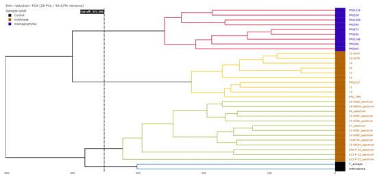 Mass spectra were acquired using an Autof MS2600 (Autobio Diagnostics, Zhengzhou, China) system to evaluate its capability in distinguishing Trichophyton species. The spectra were obtained following standard procedures for fungal protein extraction [41] and analyzed with Autof acquirer software package V2.0.196 and the profiles matched against the Autobio library V1120. The same spectral raw data were further processed and analyzed using Clover Mass Spectrometry Data Analysis Software (MSDAS) v1.10.0 (Clover Bioanalytical Software S.L., Granada, Spain), a machine learning and multivariate analysis online platform. Preprocessing steps included variance stabilization, baseline subtraction using the Tophat filter (0.02), and smoothing with the Savitzky–Golay filter (window length: 11; polynomial order: 3). Replicates were grouped to create an average spectrum per isolate, followed by alignment (constant tolerance: 2 Da; linear tolerance: 600 ppm). The processed spectra were binned at 0.5 Da intervals and were then subjected to PCA and hierarchical clustering to assess spectral differences and determine whether clustering patterns could distinguish between the two species. PCA was performed after scaling the data to identify variance in the dataset, while hierarchical clustering (HC) grouped the spectra based on spectral similarities. A prior PCA using 28 components, which accounted for 95.63% of the total variance, was applied before performing HC. Euclidean and Ward’s methods were used as the distance metric and linkage method, respectively. The optimal cut-off was calculated based on Simpson’s Diversity index (SDI) and mean coherence (mC) for the species.