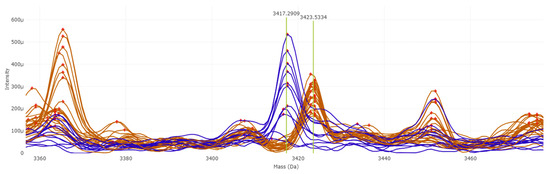 Trained supervised algorithms yielded a balanced accuracy ranging from 88.74% to 100% (Table S3). Among them, the PLS-DA and SVM algorithms achieved the best results, with 100% balanced accuracy using 10-fold cross validation as the internal validation method. Peaks at 3417.29 and 3423.53 m/z were found to be putative positive biomarkers for T. mentagrophytes and T. indotineae, respectively (Figure 3). The 3417.29 m/z peak shows an AUC of 0.9091 in the ROC curve, while the 3423.53 m/z peak achieves an AUC of 1. The q-values from the T-test are 2.375 × 10−2 and 1.947 × 10−13, respectively.