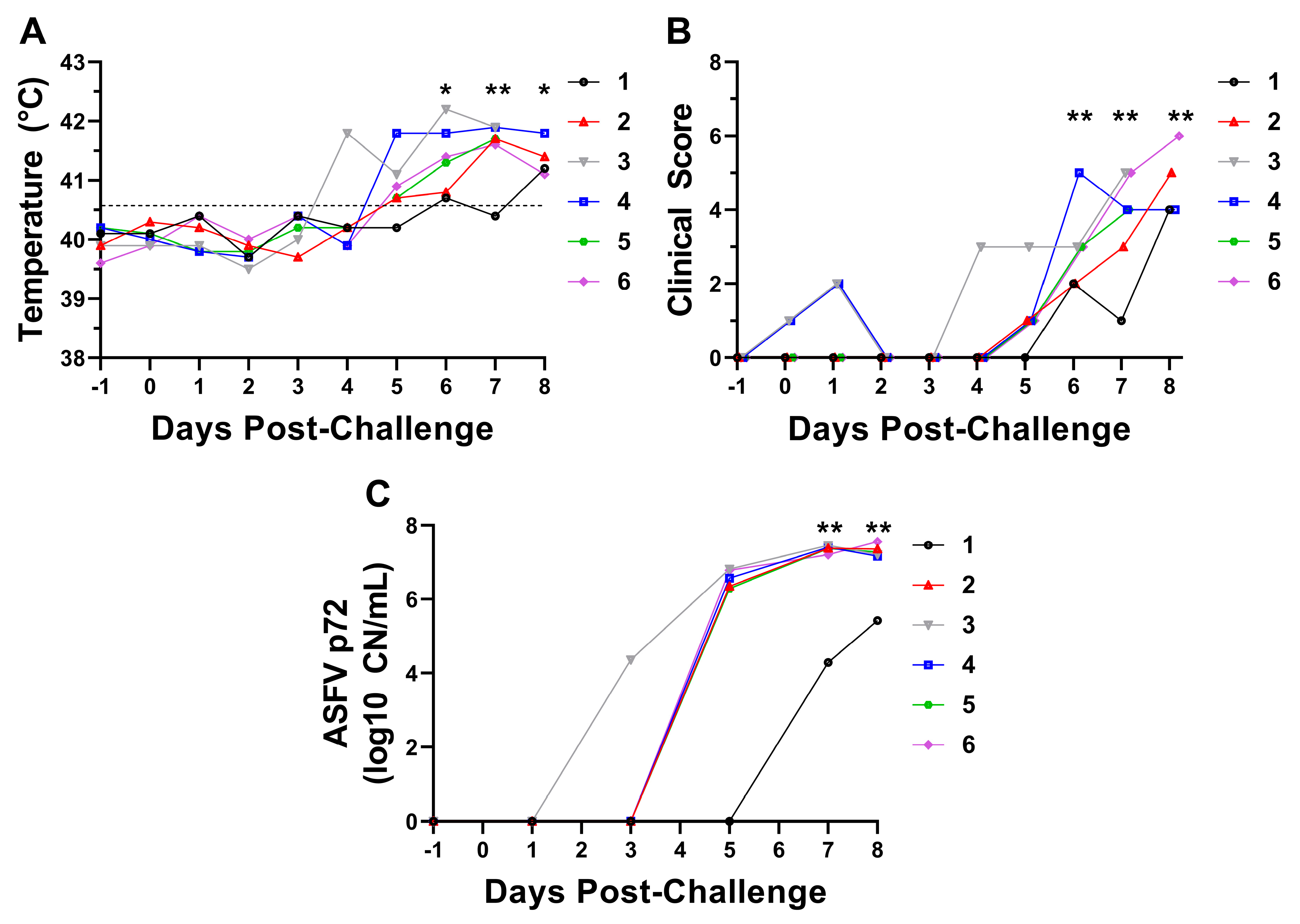 3.1. Post-Challenge Clinical Progression, Virus qPCR, and Pathology