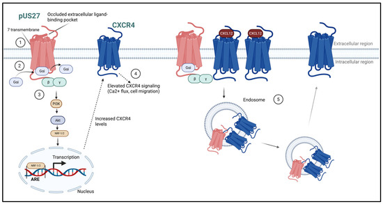 While the role pUS27 plays as a Gαi decoy is intriguing, there is another aspect of its G-protein interaction that unveils a novel signaling pathway activated by this vGPCR. Recent research has demonstrated that pUS27 signals constitutively through Gβγ and phosphoinositide 3-kinases (PI3K), leading to the activation and nuclear translocation of Nuclear Respiratory Factor 1 (NRF-1) [30]. This translocation enhances the expression of genes regulated by the Antioxidant Response Element (ARE), including C-X-C chemokine receptor type 4 (CXCR4) (Figure 1) [30], which could aid in HCMV immune evasion by stimulating stress response genes. Moreover, pUS27 elevates CD47 expression during viral infection [30]. CD47 functions in immune evasion by transmitting inhibitory signals to macrophages, thereby preventing phagocytosis. An upregulation of CD47 expression could consequently reduce the likelihood of macrophage-mediated clearance of infected cells.