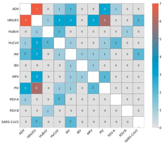 Frequency of virus combinations. Heatmap of co-infection frequencies between virus pairs.