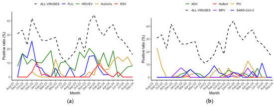 (a) Seasonal distribution of viruses with a prevalence ≥9%, including HRV/EV, influenza (FLU), RSV, and HuCoVs; (b) seasonal distribution of viruses with a prevalence <9%, including PIV1/2/3/4, MPV, ADV, HuBoV, and SARS-CoV-2. On the X-axis, the months of the study period are shown; on the Y-axis, the monthly positivity rate of each virus is reported. In both figures (a,b), a dotted line indicating the overall prevalence of viral infections is shown.