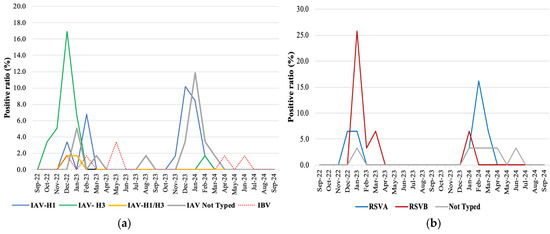 In the two epidemic seasons, peaks of viral infections occurred in the winter months, with the highest positive rates occurring in December and January in both seasons investigated. The seasonality patterns of viruses detected are shown in Figure 2a,b. In particular, during the two post-COVID-19 pandemic seasons, influenza peaks were observed starting in October 2022 and December 2023. In contrast, HRV/EV showed persistent levels of detection throughout the study period.