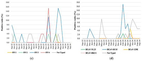(a) Seasonal incidence of IAV and IBV; (b) RSVs A-B; (c) PIVs 1–4; and (d) HuCoVs.