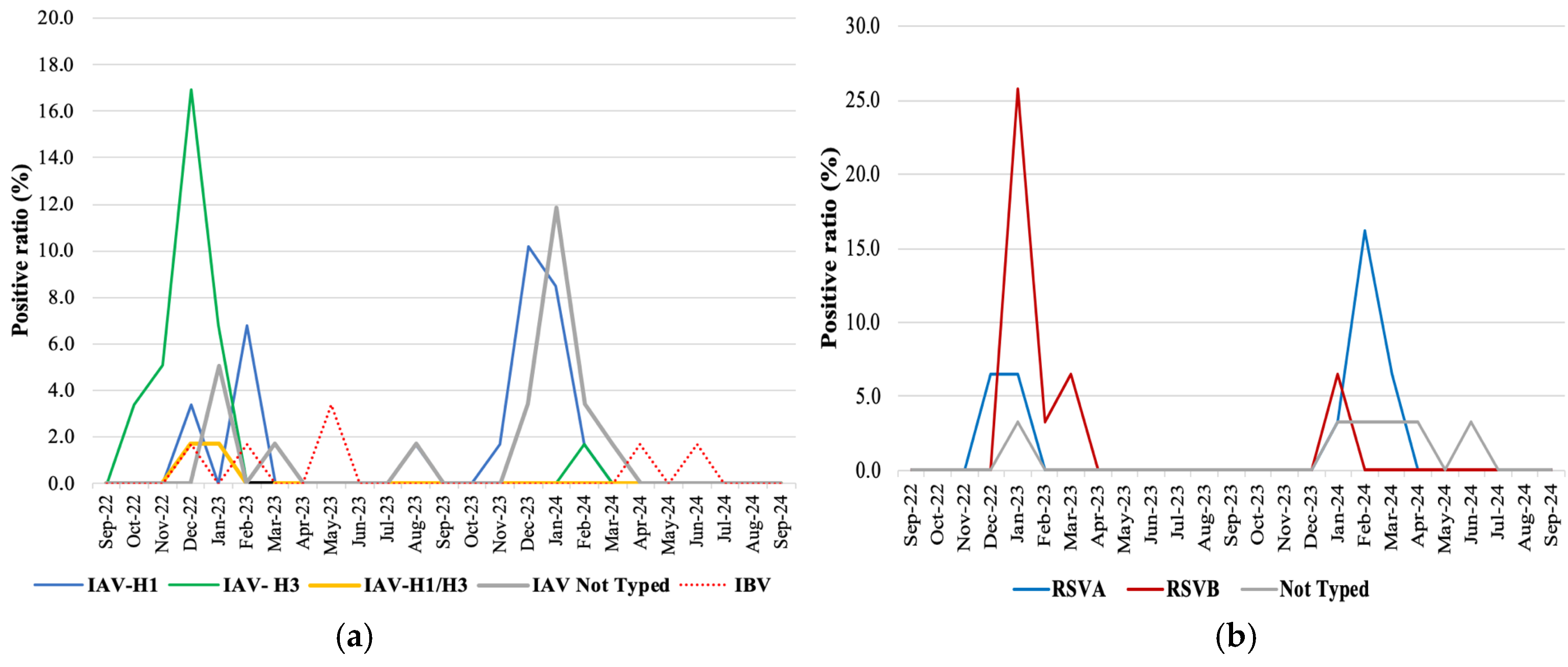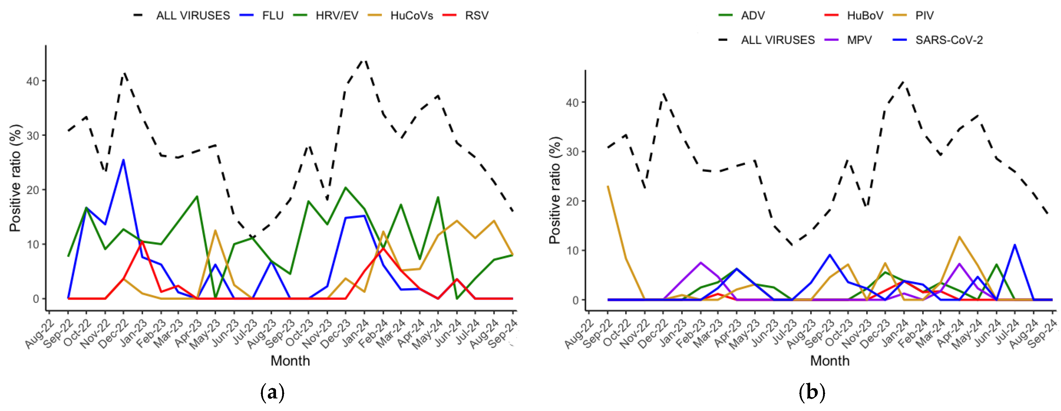 - Zhang, S.; Liang, H.; Xu, J.; Chen, B.; Zheng, X.; Lin, H.; Wang, W.; Yao, Y. Spatial-temporal dynamics and virus interference of respiratory viruses: Insights from multi-pathogen surveillance in China. J. Infect. 2025, 91, 106556. [Google Scholar] [CrossRef]