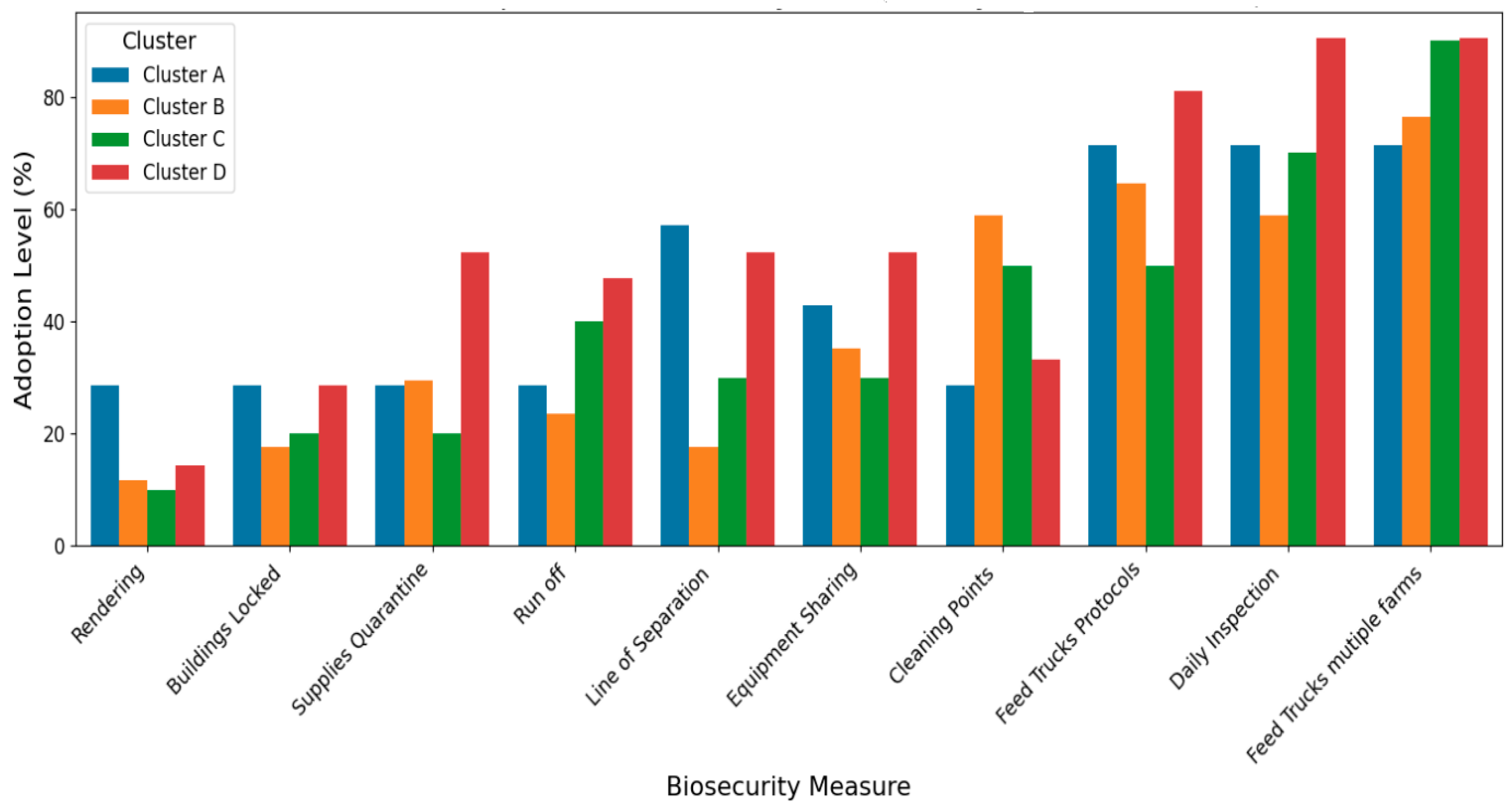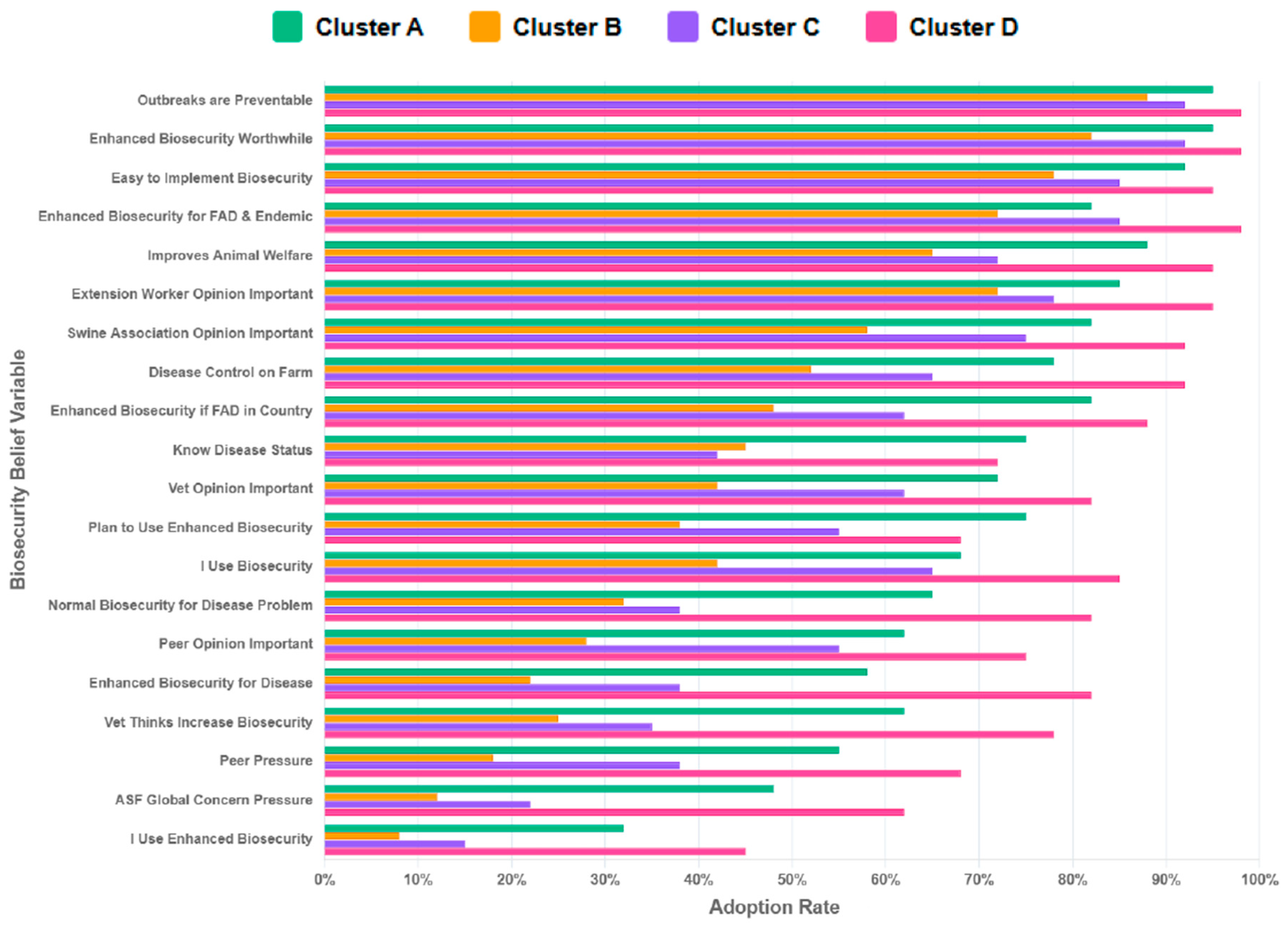 - Baye, R.S.; Zia, A.; Merrill, S.C.; Clark, E.M.; Smith, J.M.; Koliba, C. A latent class analysis of biosecurity attitudes and decision-making strategies of swine producers in the United States. Sci. Rep. 2024, 14, 17427. [Google Scholar] [CrossRef]
